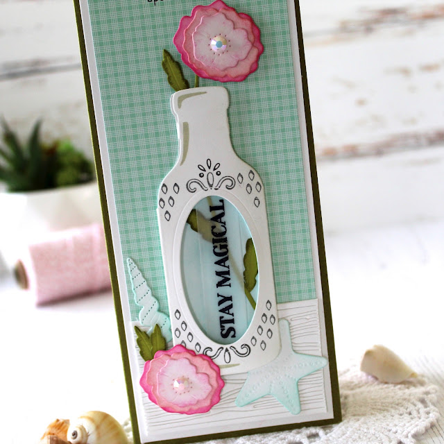 I die cut the bottle and stamped the details on the bottle with Versamark Ink and embossed with white embossing powder. Then I blended Aqua Mist Ink over the embossing. I used one of the stamps in the set to create the scene in the bottle. Then I added the seashells around the bottle.