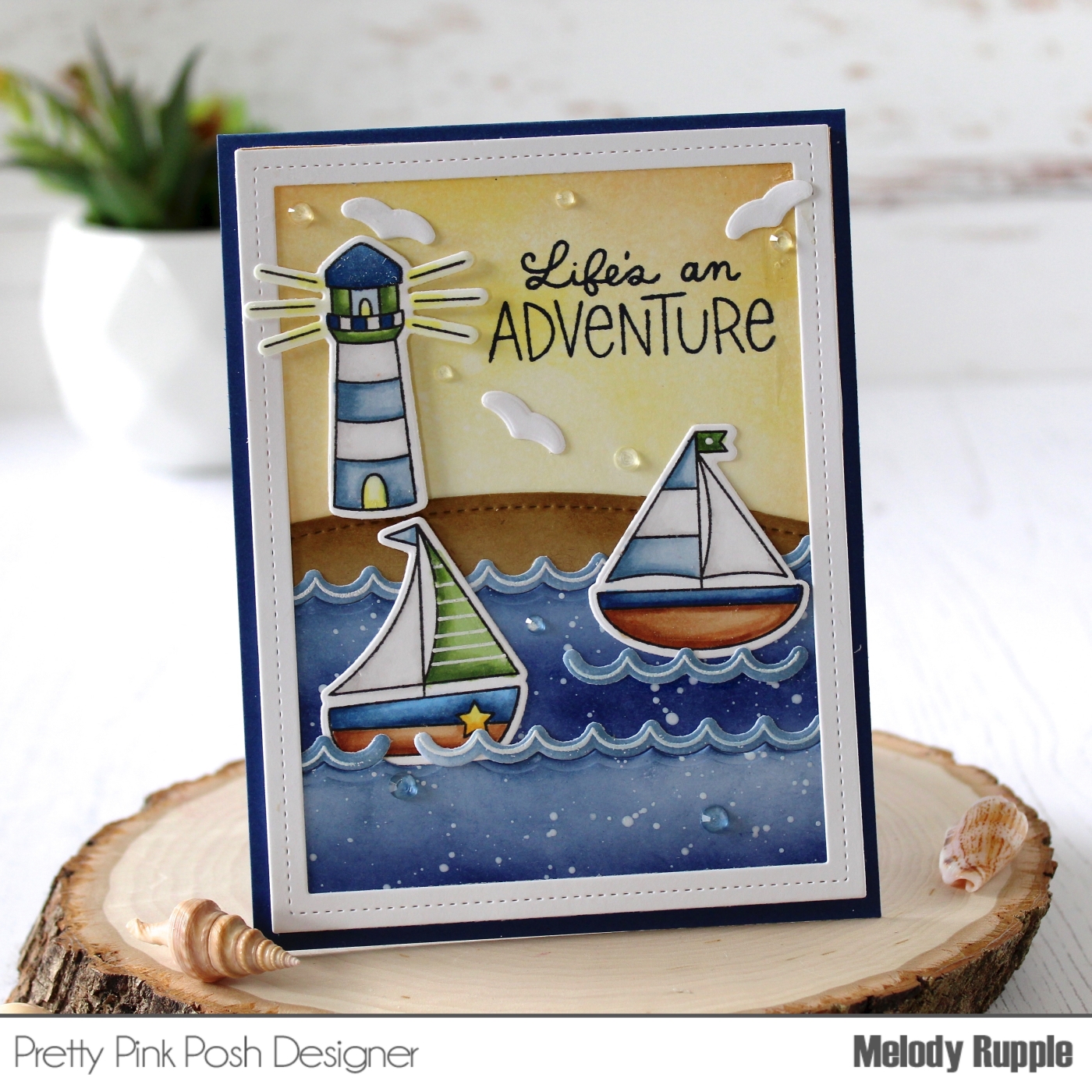 I am starting off the week with a summer card created with products from the newest Pretty Pink Posh Release. Last week I spent a few days in Santa Barbara, our first getaway in a really long time. So sun, ocean, and sailboats inspired my card today.