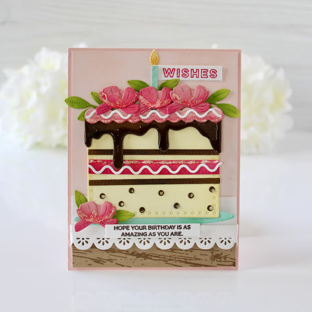 My final card features the new In Stitches: Cake Builder Dies. There are a number options for layering and decorating the cake.