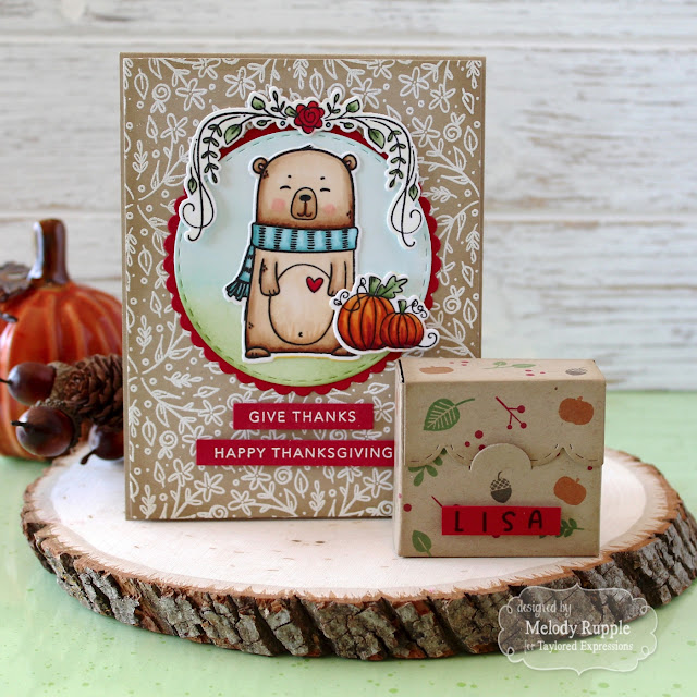 Now I want to give you a closed look at the place card favors I plan to use for Thanksgiving. The box is created with the previously release All Tucked In Die. I added the name to the front of box with the new Handlettered Alphabet Clear Stamp Set.
