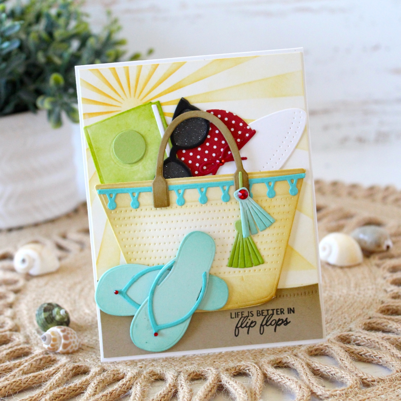 First up is a look at the new Go-To-Gift Card Holder: Beach Bag Dies. I just think this is the cutest die sets! The beach bag is also a gift card holder and there are number of options and accessories for the bag. Next I created the flip flops, sunglasses, hat, and book.