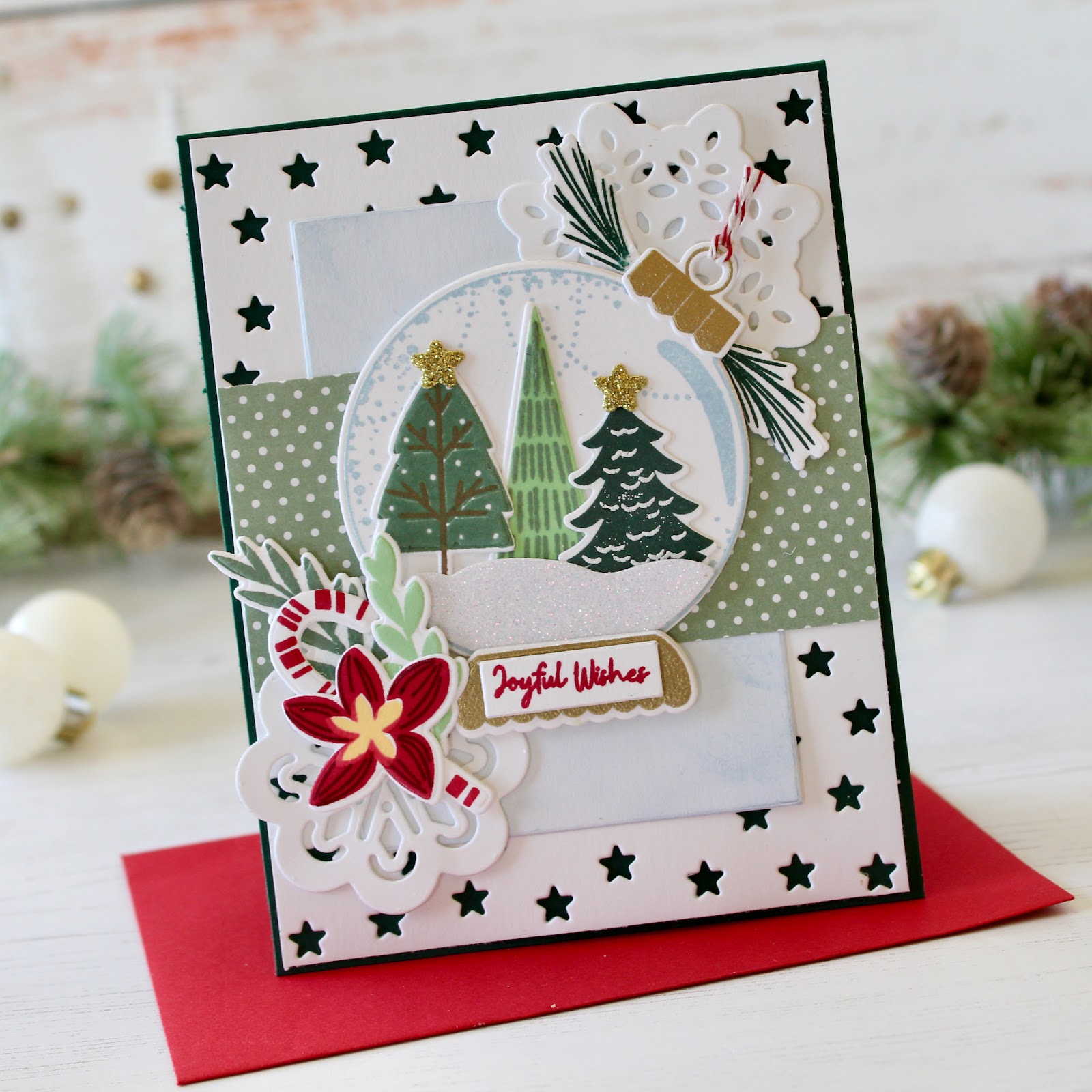 The Ornament Cloche Stamp Set and Dies also includes the flower, candy cane, an additional greenery options. The snowflakes that I added the the corners are two of the options in the new Perfect Snowflake Dies.