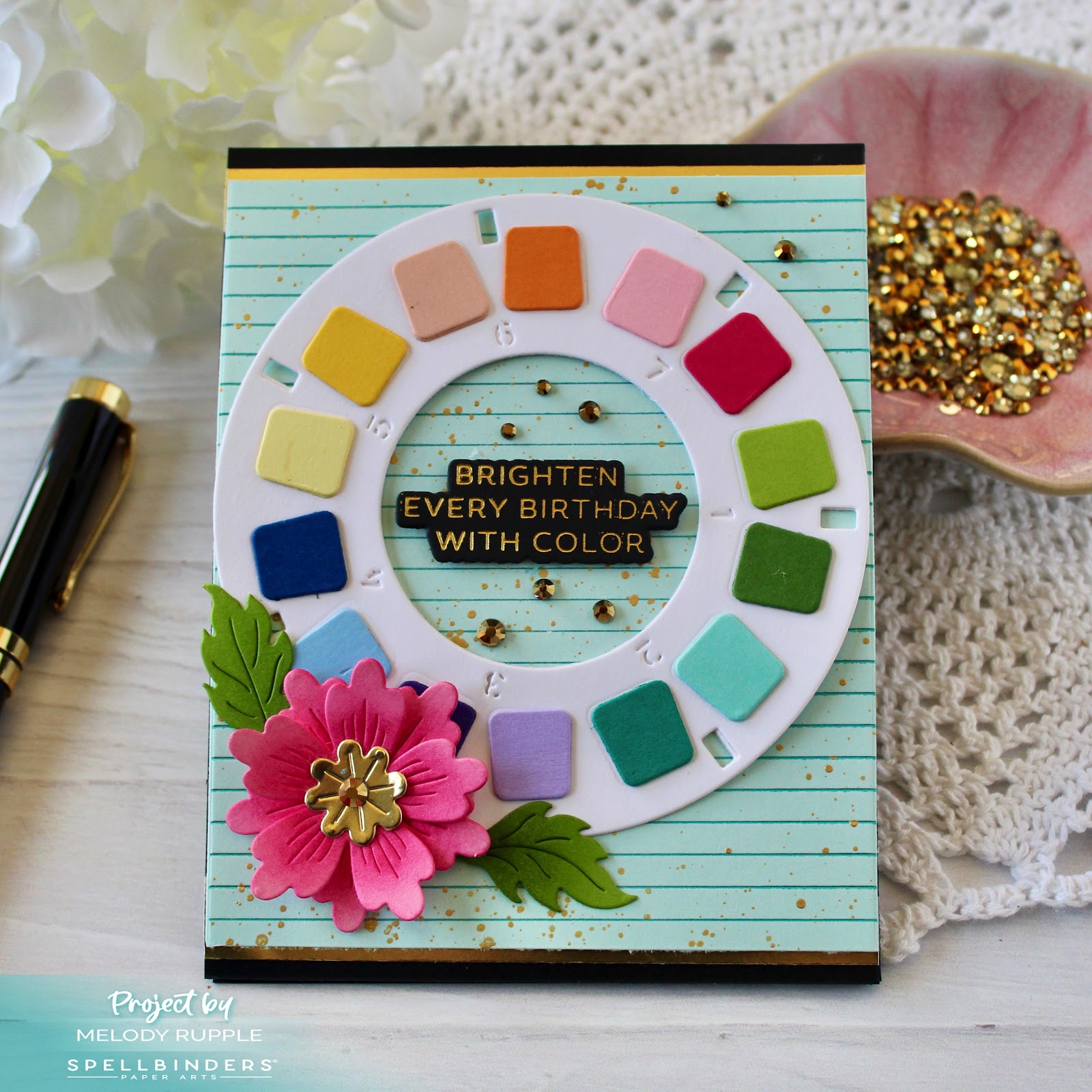My first card is centered around the new Reel Color Etched Dies. I think this die is so fun and different from anything else I own. I dic cut the wheel from white cardstock and then added the different colored cardstock in the imprinted stop on the wheel.