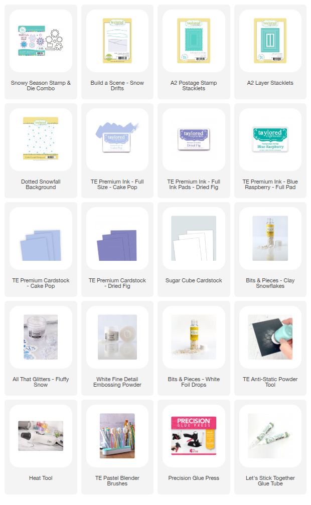 I used Cake Pop Cardstock for the background and blended Cake Pop Ink on the edges. Then I stamped the Dotted Snowfall Background Stamp in Versamark Ink and embossed with TE White Embossing Powder. I added the hills of snow at the bottom with the Build A Scene - Snow Drifts Die Set. I inked the edges with Cake Pop Ink and added TE All That Glitters - Fluffy Snow.