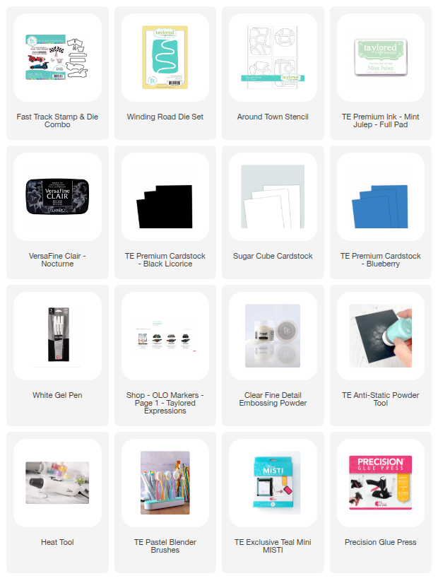 Next is a look at the Fast Track Stamp and Die Combo. A great set for all the car and car racing fans! I stamped the cars and the flags with VersaFine Clair - Nocturne Ink and embossed with TE Clear Embossing Powder to add a little extra shine to my cars. Then I colored with Olo Markers. I added Bit & Pieces - Bits & Pieces - Black Rhinestones to the wheels.