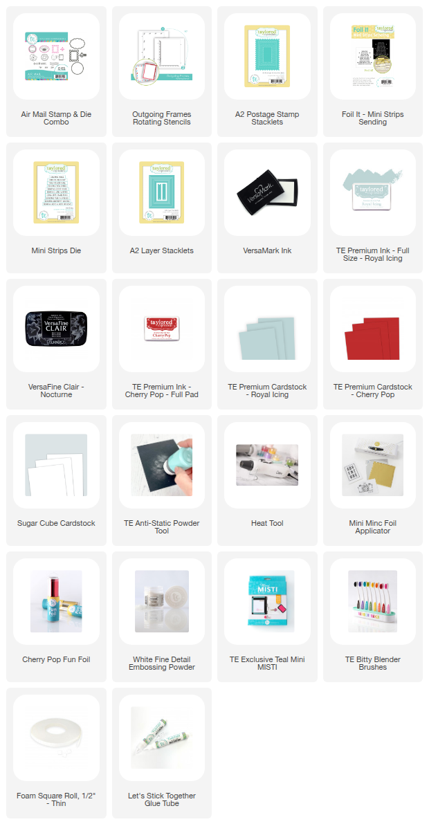 My last card features the Air Mail Stamp and Die Combo. I think I will use this stamp set on cards throughout the year. I stamped a variety of the postage themed stamps to create the background, stamping in Royal Icing Ink on Royal Icing Cardstock. I added a die cut image to the top corner and center of the card.