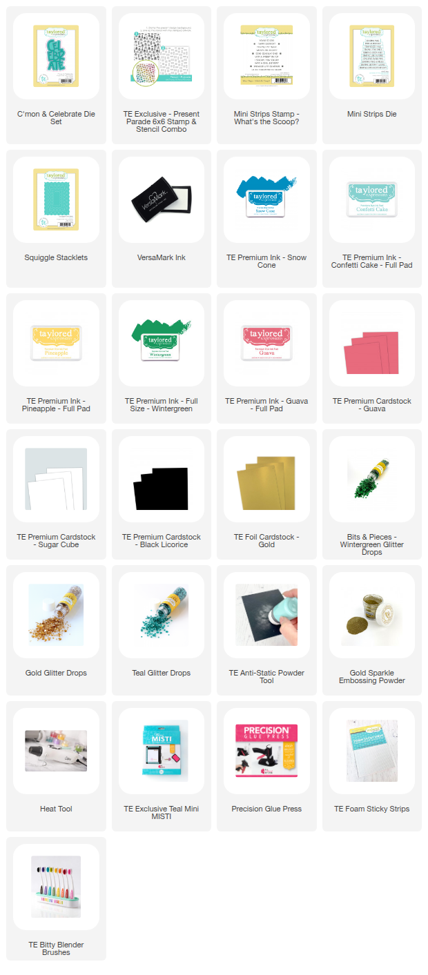 Next is a look at the C'mon & Celebrate Die Set This is a large sentiment to create the focal point of your card. There are three dies in the set to add the different layers. The smaller sentiment is from the previously released Mini Strips - What's the Scoop. I stamped in Versamark Ink on Licorice Cardstock and embossed the TE Sparkle Gold Embossing Powder.