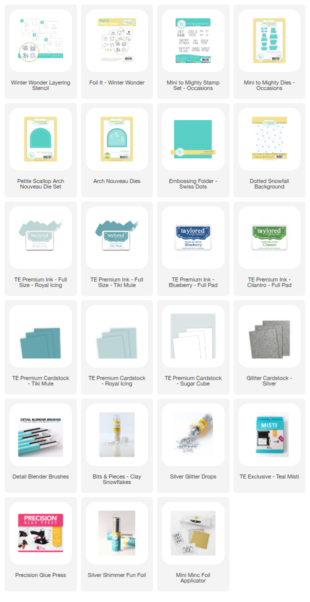 I used a combination of Royal Icing, Tiki Mule, Blueberry, and Cilantro Inks with the Foil It - Winter Wonder panel and TE Silver Shimmer Fun Foil. Each stenciled image is die cut with the Arch Nouveau Dies and matted with the new Petite Scallop Arch Nouveau Dies.