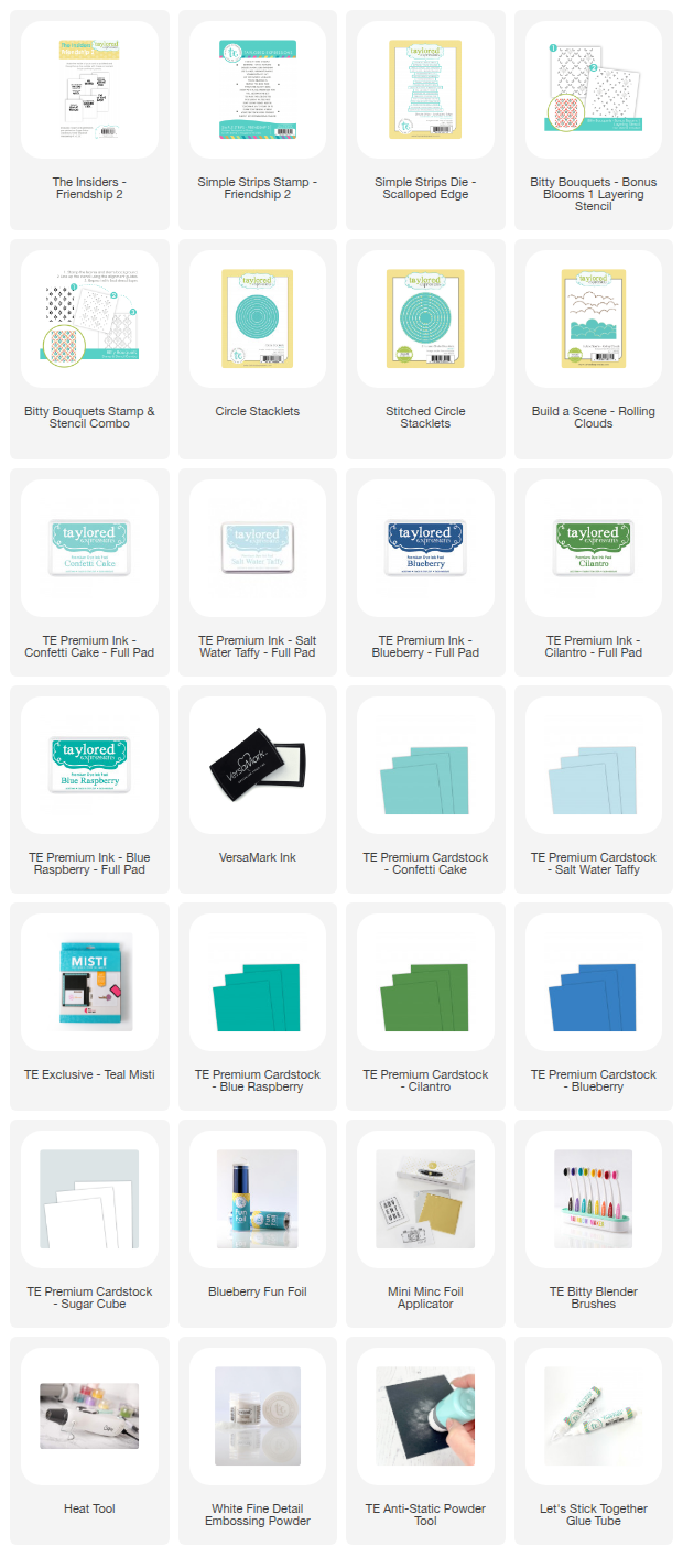 I created the background by stamping the leaves with the Bitty Bouquets Stamp and Stencil Combo and then I used the. new Bitty Bouquests - Bonus Blooms 1 Stencil to add the flowers. I used a combination of Confetti Cake, Blue Raspberry, Blueberry, and Cilantro Inks. Next I used the Circle Sticklets to cut and matt the circle in the center of card and then added the sentiment behind the circle die cut. The smaller sentiment is from the Simple Strips Stamp - Friendship 2.